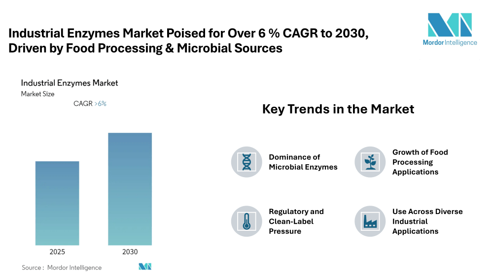 The global Industrial Enzymes Market is entering a period of steady growth. According to a recent Mordor Intelligence report, the market is expected to expand at a compound annual growth rate (CAGR) of over 6 % during the forecast period 2025-2030. While precise dollar figures are not disclosed in that report summary, growth is underpinned by increasing demand across food processing, detergents, biofuels, healthcare and other industrial sectors.