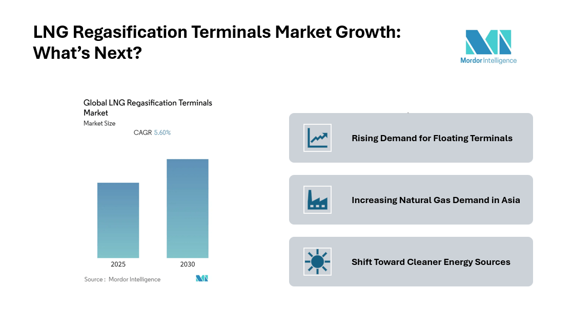 The LNG regasification terminals market plays a key role in the global natural gas supply chain, enabling liquefied natural gas (LNG) to be converted back into gaseous form for distribution and consumption. According to insights from Mordor Intelligence, the LNG regasification terminals market size is expected to expand steadily with a CAGR of 5.6% during the forecast period from 2025 to 2030, with 2026 considered a base year for analysis.