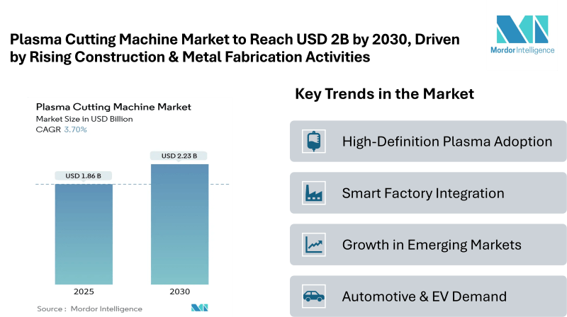 According to Mordor Intelligence, the Plasma Cutting Machine Market size is estimated at USD 1.86 billion in 2025, and is expected to reach USD 2.23 billion by 2030, at a CAGR of 3.70%. This market expansion is primarily fueled by the increasing adoption of automated systems, rising demand from automotive and transportation sectors, and the ongoing shift toward digitalized metal fabrication processes. The Asia-Pacific region currently leads the market in size, while South America is emerging as the fastest-growing region, reflecting strong demand from small and medium-sized enterprises (SMEs) and industrial expansion.