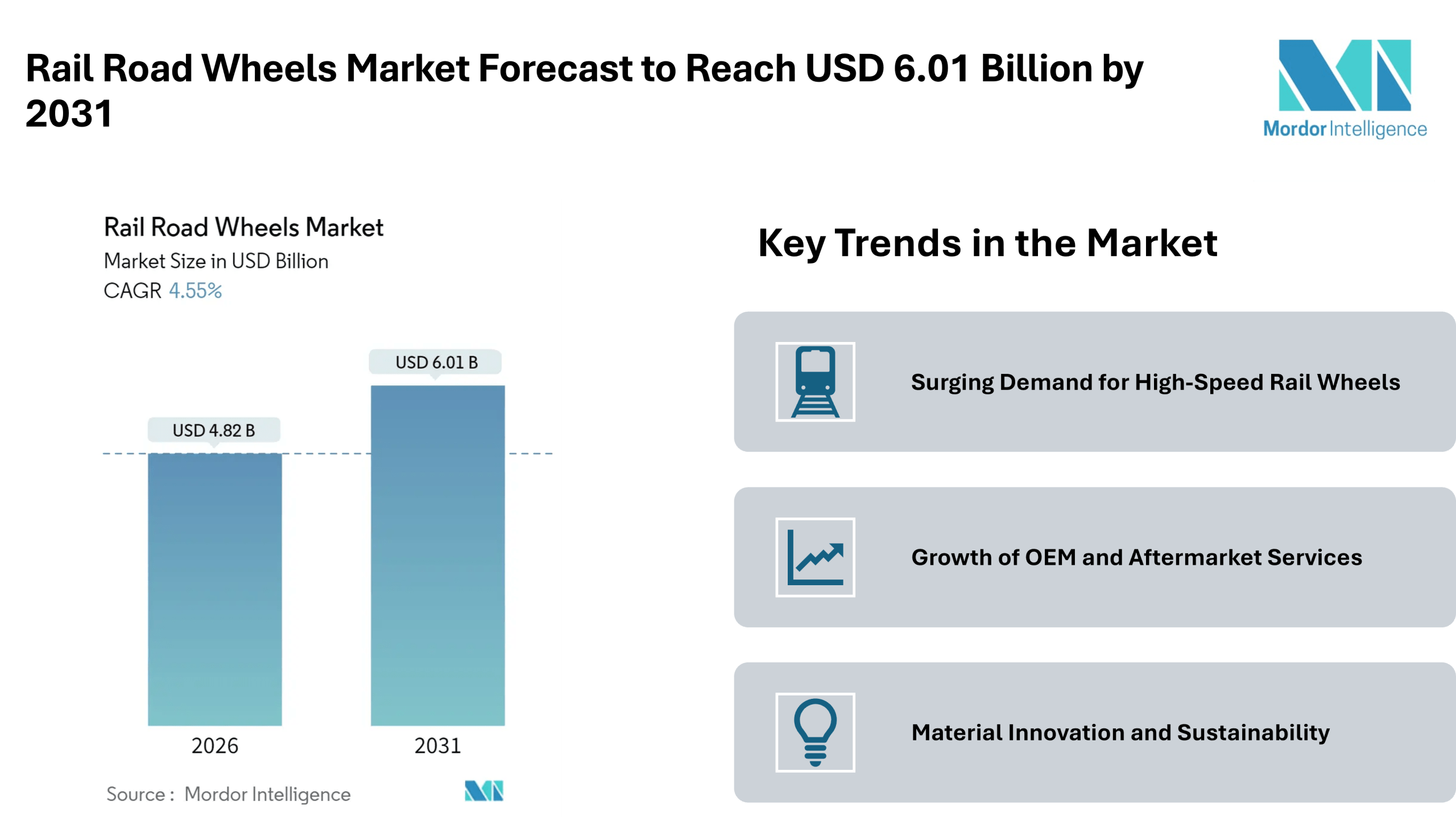 Material Innovation and Sustainability: While rolled carbon-steel remains widely used, the market is seeing a gradual shift toward composite and hybrid materials. These alternatives offer lighter weight, better noise reduction, and improved corrosion resistance. Additionally, environmental considerations are driving adoption of low-carbon wheels, particularly in Europe and North America. This trend aligns with operators’ efforts to meet regulatory and sustainability targets.