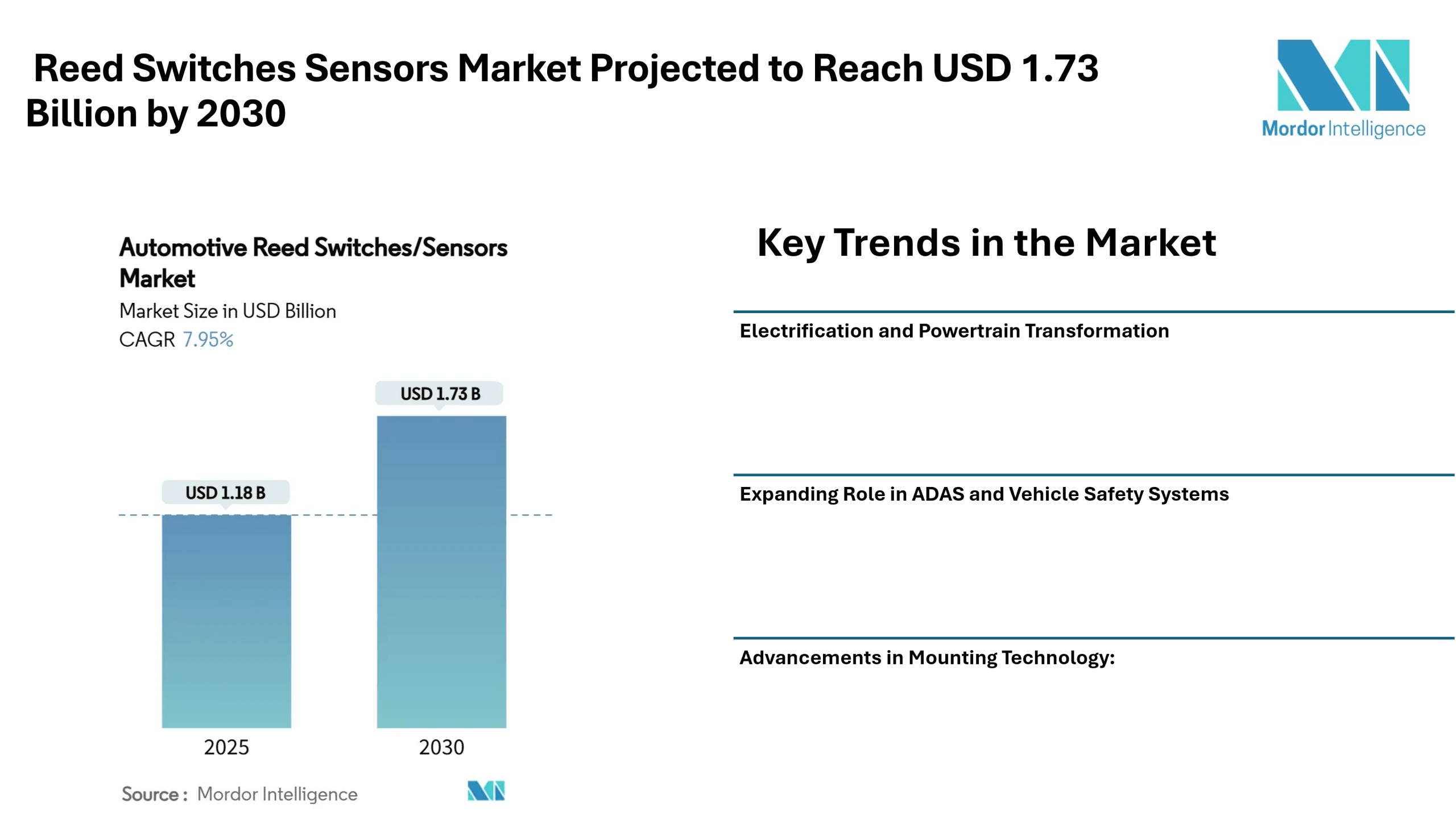 Electrification and Powertrain Transformation: The shift toward electrified powertrains and battery-based systems has intensified demand for highly reliable and efficient components such as reed switch sensors. Because reed switches consume virtually zero standby current and provide galvanic isolation in harsh environments, they are increasingly used in battery safety, disconnect, and monitoring applications. According to Mordor Intelligence, this electrification trend is a significant contributor to overall reed switches sensors market growth.