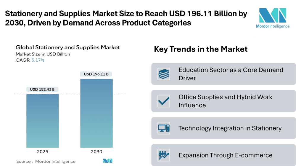 The stationery and supplies market continues to show resilience and adaptability, with demand supported by education, office needs, and evolving consumer preferences. According to industry analysis, the market size is estimated at USD 152.43 billion in 2025 and is projected to climb to USD 196.11 billion by 2030, reflecting a healthy CAGR of 5.17% during the forecast period. The stationery and supplies market growth is shaped by a combination of digital adoption, renewed emphasis on workplace essentials, and sustained interest in creative and design-focused products.