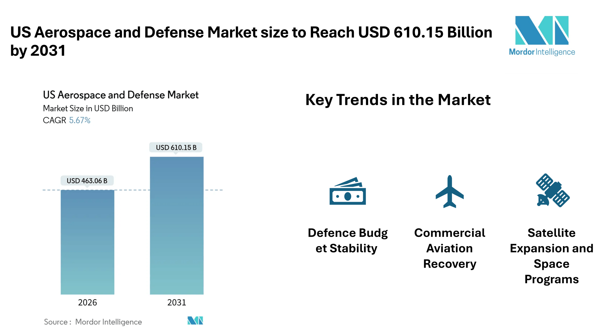 According to Mordor Intelligence, the US aerospace and defense market size is valued at USD 463.06 billion in 2026 and is expected to reach USD 610.15 billion by 2031, reflecting steady expansion supported by consistent government defense budgets, renewed commercial aircraft demand, and the rapid development of satellite infrastructure.