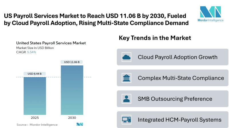 According to Mordor Intelligence, the US payroll services market size stands at USD 8.44 billion in 2025 and is forecast to expand to USD 11.06 billion by 2030, registering a 5.54% CAGR over the period. This rising adoption highlights the expanding United States Payroll Services Market share across industries and regions, demonstrating the growing importance of professional payroll services in the modern business environment.